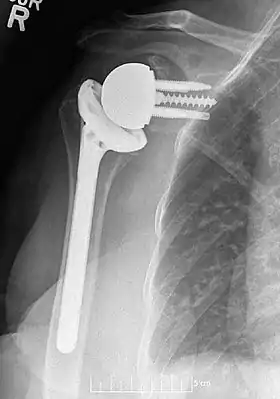 ![]() Plain film radiograph in anteroposterior (AP) view of a right shoulder status post reverse shoulder arthroplasty using a prosthesis with a lateralized center of rotation. | |