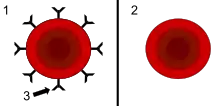 The proteins which carry the Rh antigens are transmembrane proteins, whose structure suggest that they are ion channels.[4] The main antigens are D, C, E, c and e, which are encoded by two adjacent gene loci, the RHD gene which encodes the RhD protein with the D antigen (and variants)[5] and the RHCE gene which encodes the RhCE protein with the C, E, c and e antigens (and variants).[6] There is no d antigen. Lowercase "d" indicates the absence of the D antigen (the gene is usually deleted or otherwise nonfunctional).