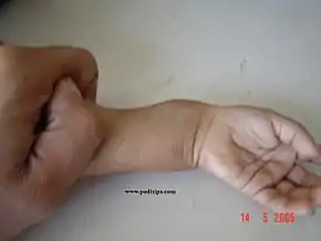 Young children may have bowed legs and thickened ankles and wrists;[13] older children may have knock knees.[10] Spinal curvatures of kyphoscoliosis or lumbar lordosis may be present. The pelvic bones may be deformed. A condition known as rachitic rosary can result as the thickening caused by nodules forming on the costochondral joints. This appears as a visible bump in the middle of each rib in a line on each side of the body. This somewhat resembles a rosary, giving rise to its name. The deformity of a pigeon chest[10] may result in the presence of Harrison's groove.