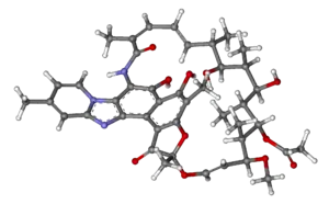 Rifaximin, is a non-absorbable, broad spectrum antibiotic mainly used to treat travelers' diarrhea. It is based on the rifamycin antibiotics family. Since its approval in Italy in 1987, it has been licensed in over more than 30 countries for the treatment of a variety of gastrointestinal diseases like irritable bowel syndrome, and hepatic encephalopathy. It acts by inhibiting RNA synthesis in susceptible bacteria by binding to the RNA polymerase enzyme. This binding blocks translocation, which stops transcription.[3] It is marketed under the brand name Xifaxan by Salix Pharmaceuticals.[4]