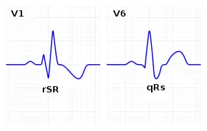 - rsr, rsR, or rSR in leads V1 or V2.