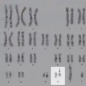 Ring chromosome 22 is caused by a ring chromosome, a form of chromosome mutation where the ends of a chromosome lose genetic material and attach to one another, forming a ring. Chromosome 22 is one of the acrocentric chromosomes, meaning the short arm is unusually small and lacks genes relevant to development; accordingly, the phenotype of ring chromosome 22 is caused only by the loss of genes in the long arm.[1] The amount of genes lost in a deletion can vary significantly, with reports of the loss of anywhere between 0.15% and 21% of chromosome 22 in different symptomatic cases.[2]