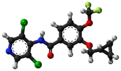 Roflumilast, sold under the trade name Daxas among others, is a drug that acts as a selective, long-acting inhibitor of the enzyme phosphodiesterase-4 (PDE-4). It has anti-inflammatory effects and is used as an orally administered drug for the treatment of inflammatory conditions of the lungs such as chronic obstructive pulmonary disease (COPD).[7][8][9][10]