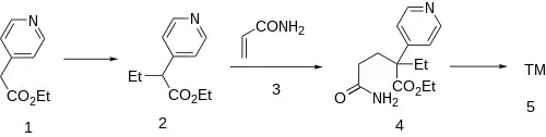 Base catalyzed alkylation of ethyl 4-pyridylacetate [54401-85-3] (1) with iodoethane gives ethyl 2-(4-pyridyl)butyrate [76766-56-8] (2). Base catalyzed conjugate addition of the carbanion to acrylamide (3) gives (4). The last step is an intramolecular cyclization to rogletimide (5).