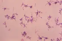 Rothia is a Gram-positive, aerobic, rod-shaped and non-motile bacterial genus from the family Micrococcaceae.[1][2][3] Rothia bacteria can cause disease in humans and immunosuppressed humans.[4][5]