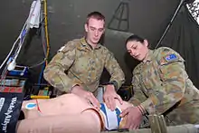 The development of medical units within the Australian colonial forces had begun in the mid-1850s when the colonial military forces had been in their infancy. Initially, it had been limited largely to single doctors who were attached to infantry units in an honorary role, but as the colonial military forces had become more sophisticated, various medical units or corps were formed, consisting of a variety of personnel including doctors, non-commissioned officers, orderlies, bearers, and dispensers as well as cooks and drivers.[12] Within each colony, these units were tasked with various duties including conducting medical examinations of recruits, and providing emergency medical aid during field manoeuvres; initially, they were unpaid volunteers, but eventually a system of paid part-time soldiering developed.[11] The reliance upon part-time professionals is a common theme in the corps' development, due largely the nature of the specialised skill sets required by some personnel, particularly doctors and surgeons; however, as the corps' role has expanded, it has become a broader organisation, with personnel serving in many capacities including professional and non-professional roles including stretcher bearers, orderlies, medical assistants, pathologists, radiographers, pharmacists, drivers, physiotherapists, as well as the traditional domains of the medical officer, and in many of these areas, particularly after the Second World War there has been an expansion of the size of the corps' regular personnel, although Reservists continue to provide much of its higher clinically trained personnel.[13]