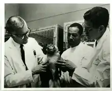 Laboratory monkey inspected by Drs. Harry M. Meyer, Jr. (left) and Paul D. Parkman (right), assisted by Rudyard Wallace, technician (center).