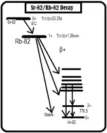 Rubidium-82 is produced through beta plus decay from its parent nucleus, strontium-82. The generator contains accelerator produced 82Sr adsorbed on stannic oxide in a lead-shielded column and provides a means for obtaining sterile nonpyrogenic solutions of RbCl(Halide salt form capable of injection). The amount (millicuries) of 82Rb obtained in each elution will depend on the potency of the generator. When eluted at a rate of 50 mL/minute, each generator eluate at the end of elution should not contain more than 0.02 microcuries of strontium 82Sr and not more than 0.2 microcuries of 85Sr per millicurie of 82RbCl injection, and not more than 1 microgram of tin per mL of eluate.[8]