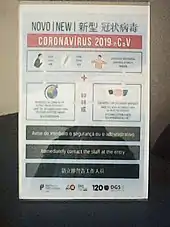 Human-to-human transmission of SARS‑CoV‑2 was confirmed on 20 January 2020 during the COVID-19 pandemic.[16][40][41][42] Transmission was initially assumed to occur primarily via respiratory droplets from coughs and sneezes within a range of about 1.8 metres (6 ft).[43][44] Laser light scattering experiments suggest that speaking is an additional mode of transmission[45][46] and a far-reaching[47] one, indoors, with little air flow.[48][49] Other studies have suggested that the virus may be airborne as well, with aerosols potentially being able to transmit the virus.[50][51][52] During human-to-human transmission, between 200 and 800 infectious SARS‑CoV‑2 virions are thought to initiate a new infection.[53][54][55] If confirmed, aerosol transmission has biosafety implications because a major concern associated with the risk of working with emerging viruses in the laboratory is the generation of aerosols from various laboratory activities which are not immediately recognizable and may affect other scientific personnel.[56] Indirect contact via contaminated surfaces is another possible cause of infection.[57] Preliminary research indicates that the virus may remain viable on plastic (polypropylene) and stainless steel (AISI 304) for up to three days, but it does not survive on cardboard for more than one day or on copper for more than four hours.[10] The virus is inactivated by soap, which destabilizes its lipid bilayer.[58][59] Viral RNA has also been found in stool samples and semen from infected individuals.[60][61]