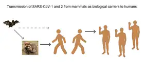 SARS‑CoV‑2 is a virus of the species severe acute respiratory syndrome–related coronavirus (SARSr-CoV), related to the SARS-CoV-1 virus that caused the 2002–2004 SARS outbreak.[17] Despite its close relation to SARS-CoV-1, its closest known relatives, with which it forms a sister group, are the derived SARS viruses BANAL-52 and RaTG13.[18] Available evidence indicates that it is most likely of zoonotic origin and has close genetic similarity to bat coronaviruses, suggesting it emerged from a bat-borne virus.[19] Research is ongoing as to whether SARS‑CoV‑2 came directly from bats or indirectly through any intermediate hosts.[20] The virus shows little genetic diversity, indicating that the spillover event introducing SARS‑CoV‑2 to humans is likely to have occurred in late 2019.[21]