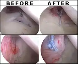 Surgical treatment of SLAP tears has become more common in recent years. The success rate for repairing isolated SLAP tears is reported between 74-94%.[7] While surgery can be performed as a traditional open procedure, an arthroscopic technique[8] is currently favored being less intrusive with low chance of iatrogenic infection.[9]