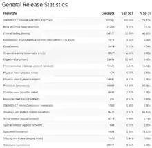 The historical strength of SNOMED was its coverage of medical specialties. SNOMED RT, with over 120,000 concepts, was designed to serve as a common reference terminology for the aggregation and retrieval of pathology health care data recorded by multiple organizations and individuals. The strength of CTV3 was its terminologies for general practice. CTV3, with 200,000 interrelated concepts, was used for storing structured information about primary care encounters in individual, patient-based records.[11] The January 2020 release of the SNOMED CT International Edition included more than 350,000 concepts.[12]