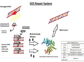 During normal growth, the SOS genes are negatively regulated by LexA repressor protein dimers. Under normal conditions, LexA binds to a 20-bp consensus sequence (the SOS box) in the operator region for those genes. Some of these SOS genes are expressed at certain levels even in the repressed state, according to the affinity of LexA for their SOS box. Activation of the SOS genes occurs after DNA damage by the accumulation of single stranded (ssDNA) regions generated at replication forks, where DNA polymerase is blocked. RecA forms a filament around these ssDNA regions in an ATP-dependent fashion, and becomes activated.[4] The activated form of RecA interacts with the LexA repressor to facilitate the LexA repressor's self-cleavage from the operator.[4][5]