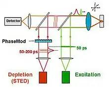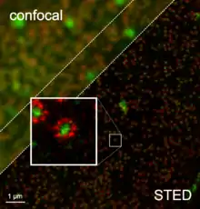 Stimulated emission depletion (STED) microscopy is one of the techniques that make up super-resolution microscopy. It creates super-resolution images by the selective deactivation of fluorophores, minimizing the area of illumination at the focal point, and thus enhancing the achievable resolution for a given system.[1] It was developed by Stefan W. Hell and Jan Wichmann in 1994,[2] and was first experimentally demonstrated by Hell and Thomas Klar in 1999.[3] Hell was awarded the Nobel Prize in Chemistry in 2014 for its development. In 1986, V.A. Okhonin[4] (Institute of Biophysics, USSR Academy of Sciences, Siberian Branch, Krasnoyarsk) had patented the STED idea.[5] This patent was unknown to Hell and Wichmann in 1994.