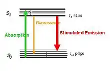 Jablonski diagram showing the redshift of the stimulated photon. This redshift allows the stimulated photon to be ignored.