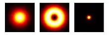 Excitation spot (2D, left), doughnut-shape de-excitation spot (center) and remaining area allowing fluorescence (right).