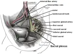 In human anatomy, the sacral plexus is a nerve plexus which provides motor and sensory nerves for the posterior thigh, most of the lower leg and foot, and part of the pelvis. It is part of the lumbosacral plexus and emerges from the lumbar vertebrae and sacral vertebrae (L4-S4).[1] A sacral plexopathy is a disorder affecting the nerves of the sacral plexus, usually caused by trauma, nerve compression, vascular disease, or infection. Symptoms may include pain, loss of motor control, and sensory deficits.
