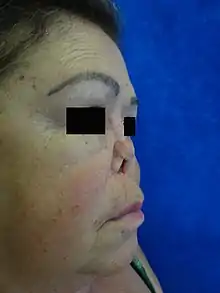 Saddle nose is a condition associated with nasal trauma, congenital syphilis, relapsing polychondritis, granulomatosis with polyangiitis, cocaine abuse, and leprosy, among other conditions.[1] The most common cause is nasal trauma. It is characterized by a loss of height of the nose, because of the collapse of the bridge. The depressed nasal dorsum may involve bony, cartilaginous, or both bony and cartilaginous components of the nasal dorsum.