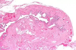 | Micrograph of salpingitis isthmica nodosa, showing the characteristic nodular thickening. H&E stain. | |