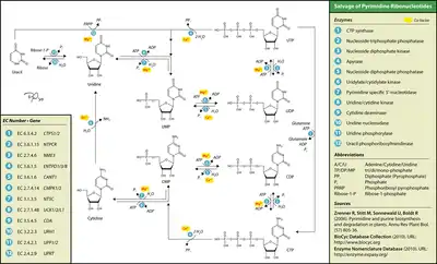 The nucleosides cytidine and deoxycytidine can be salvaged along the uracil pathway by cytidine deaminase, which converts them to uridine and deoxyuridine, respectively. Alternatively, uridine–cytidine kinase can phosphorylate them into cytidine monophosphate (CMP) or deoxycytidine monophosphate (dCMP). UMP/CMP kinase can phosphorylate (d)CMP into cytidine diphosphate or deoxycytidine diphosphate, which nucleoside diphosphate kinase can phosphorylate into cytidine triphosphate or deoxycytidine triphosphate.