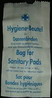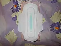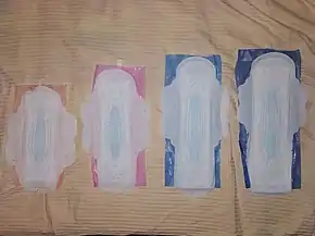 A menstrual pad, or simply a pad, (also known as a sanitary pad, sanitary towel, sanitary napkin or feminine napkin) is an absorbent item worn by women in their underwear when menstruating, bleeding after giving birth, recovering from gynecologic surgery, experiencing a miscarriage or abortion, or in any other situation where it is necessary to absorb a flow of blood from the vagina. A menstrual pad is a type of menstrual hygiene product that is worn externally, unlike tampons and menstrual cups, which are worn inside the vagina. Pads are generally changed by being stripped off the pants and panties, taking out the old pad, sticking the new one on the inside of the panties and pulling them back on. Pads are recommended to be changed every 3–4 hours to avoid certain bacteria that can fester in blood; this time also may differ depending on the kind worn, flow, and the time it is worn.[1]