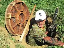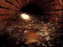 Stoneware sanitary sewer (bottom) submerged in trash and fecalia