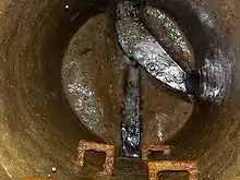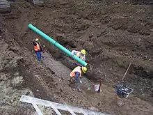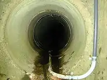 A force main or rising main[8] is a pumped sewer that may be necessary where gravity sewers serve areas at lower elevations than the sewage treatment plant, or distant areas at similar elevations. A lift station is a sewer sump that lifts accumulated sewage to a higher elevation. They may also be used to prime an inverted siphon used to cross underneath rivers or other obstructions. The pump may discharge to another gravity sewer or directly to a treatment plant.[6] Force mains are typically constructed of welded steel or HDPE jointed to resist pressures within the pipe. Force mains are substantially different from pressure sewers which serve individual properties or groups of properties and provide a means of injecting sewage into a local gravity main.