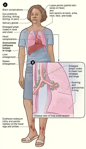 Sarcoidosis (also known as Besnier-Boeck-Schaumann disease) is a disease involving abnormal collections of inflammatory cells that form lumps known as granulomata.[2] The disease usually begins in the lungs, skin, or lymph nodes.[2] Less commonly affected are the eyes, liver, heart, and brain, though any organ can be affected.[2] The signs and symptoms depend on the organ involved.[2] Often, no, or only mild, symptoms are seen.[2] When it affects the lungs, wheezing, coughing, shortness of breath, or chest pain may occur.[3] Some may have Löfgren syndrome with fever, large lymph nodes, arthritis, and a rash known as erythema nodosum.[2]