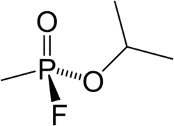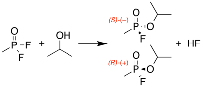 Sarin is a chiral molecule because it has four chemically distinct substituents attached to the tetrahedral phosphorus center.[24] The SP form (the (–) optical isomer) is the more active enantiomer due to its greater binding affinity to acetylcholinesterase.[25][26] The P-F bond is easily broken by nucleophilic agents, such as water and hydroxide. At high pH, sarin decomposes rapidly to nontoxic phosphonic acid derivatives.[27]