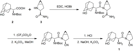 The synthesis of saxagliptin by Bristol-Myers Squibb by the amide coupling of N-Boc-3-hydroxyadamantylglycine (2) and methanoprolineamide (3) with EDC. The former is commercially available, whereas the latter is available as the N-Boc analog. The prolineamide moiety is subsequently dehydrated with trifluoroacetic anhydride to give the cyanide as the trifluoracetate ester, which is hydrolyzed. Removal of the Boc protecting group, followed by neutralization gives the desired product (1):[17]