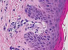 Additional testing may aid diagnosis. A skin biopsy may be taken to determine capillaritis of dermal vessels.[8] Capillaritis or pigmented purpura is skin condition that has brown-reddish patches on the skin, which is caused by leaky capillaries.[9] Such skin biopsies are sent to a laboratory for a pathological examination, where each biopsy is observed under a microscope.[3] A dermatologist may also perform a dermatoscopy.[3]