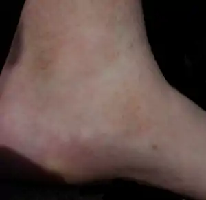 | Rust-colored spots typical of Schamberg disease on the lower left leg and left foot of a 26-year-old Caucasian male. | |