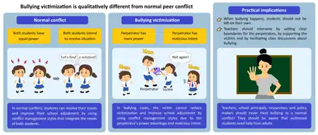 Bullying is a subcategory of aggressive behavior that is characterised by hostile intent (the harm caused is deliberate), imbalance of power (real or perceived power inequality between bully and victim), and repetition over a period of time.[18][19][20] More ordinary types of student-student conflicts, which are sometimes part of everyday school life, are not associated with an imbalance of power. In contrast to more ordinary conflicts, school bullying can severely harm victimized students.[21]