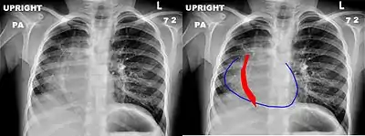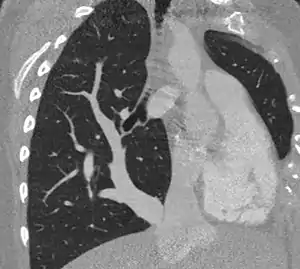 Scimitar syndrome, or congenital pulmonary venolobar syndrome, is a rare congenital heart defect characterized by anomalous venous return from the right lung (to the systemic venous drainage, rather than directly to the left atrium).[1] This anomalous pulmonary venous return can be either partial (PAPVR) or total (TAPVR). The syndrome associated with PAPVR is more commonly known as Scimitar syndrome after the curvilinear pattern created on a chest radiograph by the pulmonary veins that drain to the inferior vena cava.[2] This radiographic density often has the shape of a scimitar, a type of curved sword.[2] The syndrome was first described by Catherine Neill in 1960.[3]