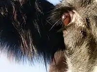 Human eyes are somewhat distinctive in the animal kingdom in that the sclera is very plainly visible whenever the eye is open. This is not just due to the white color of the human sclera, which many other species share, but also to the fact that the human iris is relatively small and comprises a significantly smaller portion of the exposed eye surface compared to other animals. It is theorized that this adaptation evolved because of our social nature as the eye became a useful communication tool in addition to a sensory organ. It is believed that the conspicuous sclera of the human eye makes it easier for one individual to identify where another individual is looking, increasing the efficacy of this particular form of nonverbal communication, called cooperative eye hypothesis.[10] Animal researchers have also found that, in the course of their domestication, dogs have also developed the ability to pick up visual cues from the eyes of humans. Dogs do not seem to use this form of communication with one another and only look for visual information from the eyes of humans.[11]