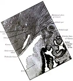 It is the origin of the longitudinal and circular fibres (which swerve acutely from the spur to run circumferentially, as a sphincter near the periphery of the lens)[1] of the ciliary muscle, and is attached posteriorly to the trabecular meshwork.