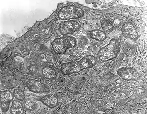Scrub typhus is transmitted by some species of trombiculid mites ("chiggers", particularly Leptotrombidium deliense),[5] which are found in areas of heavy scrub vegetation. The mites feed on infected rodent hosts and subsequently transmit the parasite to other rodents and humans. The bite of this mite leaves a characteristic black eschar that is useful to the doctor for making the diagnosis.[6]