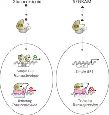 Just like glucocorticoids, SEGRAMs bind to and activate GR. However, in contrast to glucocorticoids, SEGRAMs selectively activate the GR in such a way that they yield an improved therapeutic benefit. Generally, for specific inflammation-based diseases, SEGRAMs should more strongly transrepress than transactivate, or better yet solely transrepress and fail to transactivate. This type of selective GR activation should result in fewer side effects than the expected side effects that appear with a chronic treatment with classic glucocorticoids.[16]