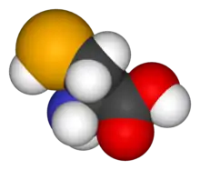Selenocysteine is the Se-analogue of cysteine. It is rarely encountered outside of living tissue (and is not available commercially) because it is very susceptible to air-oxidation. More common is the oxidized derivative selenocystine, which has an Se-Se bond.[7] Both selenocysteine and selenocystine are white solids. The Se-H group is more acidic (pKa = 5.43) than the thiol group; thus, it is deprotonated at physiological pH.[8]