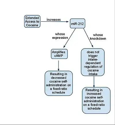 A 2010 study published in Nature showed an upregulation of microRNA-212 in the dorsal striatum of rats previously exposed to cocaine for extended periods.[24] Animals infected with a viral vector overexpressing miR-212 in the dorsal striatum produced the same initial levels of cocaine intake; however, drug consumption progressively decreased as net cocaine exposure increased. The authors of the study noted that viral-infected animals exhibited decreased operant responding during the post-infusion time-out period and proposed that this demonstrated a reduction in compulsive drug-seeking behavior.(Hollander et al.) miR-212 acts through Raf1 to enhance the CREB response; CREB-TORC is known to negatively regulate the reinforcing effects of cocaine. (Hollander et al.) This study provides one example (miR-212, owing to its amplification of CREB) of a self-administration study that may provide potential therapeutic targets for the treatment of cocaine addiction. One of the most important advances to emerge from self-administration studies comes from a behavioral model for addiction in animals.[25] This model relies on observation of three separate phenomena to classify a rat as “addicted:” 1) 'Persistence in drug-seeking: Depends on the attempts of rats to obtain drug during time-out or no-periods in the self-administration apparatus. 2) Resistance to punishment: Measured by how much rats maintain rates of self-administration when cocaine infusion is paired with an electric shock. 3) Motivation for the drug: Measured by the breakpoint in progressive ratio reinforcement. (Deroche-Gamonet et al.)