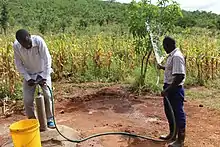 Other solutions have focused on innovative pump systems, including hand-pumps, Water for People's "Play Pumps",[17] and Pump Aid's "Elephant Pumps".[18] All three designs are built to aid communities in drawing clean water from wells. The hand pump is the most basic and simple to repair, with replacement parts easily found.[19] Using a more creative approach, Play Pumps combine child's play with clean water extraction through the use of playground equipment, called a roundabout. The idea behind this is as children play on the roundabout, water will simultaneously be pumped from a reservoir tank to either toilets, hand washing stations, or for drinking water.[18] Some downsides to the PlayPump, though, are its inability to address situations of physical water scarcity and the danger of exploitation when children's play is equated with pumping water.[20] Alternatively, Elephant Pumps are simple hand water pumps. After a well is prepared, a rope-pump mechanism is installed that is easy to maintain, uses locally sourced parts, and can be up and running in the time span of about a week.[18] The Elephant Pump can provide 250 people with 40 litres of clean water per person per day.[21]