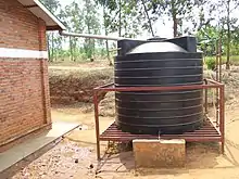 Rainwater harvesting is one of the simplest and oldest methods of self-supply. This can be as simple as putting a bucket at the edge of a tin roof. It can also involve the construction of small reservoirs and gutters along the edge of a roof to collect a larger quantity of water.[22]