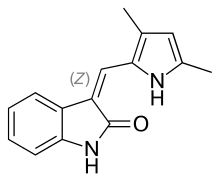 Semaxanib (INN,[1] codenamed SU5416) is a tyrosine-kinase inhibitor drug designed by SUGEN as a cancer therapeutic. It is an experimental stage drug, not licensed for use on human patients outside clinical trials. Semaxanib is a potent and selective synthetic inhibitor of the Flk-1/KDR vascular endothelial growth factor (VEGF) receptor tyrosine kinase. It targets the VEGF pathway, and both in vivo and in vitro studies have demonstrated antiangiogenic potential.