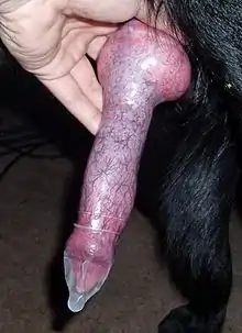 In order to collect semen from a male dog, an artificial vagina is prepared,[15][16] which is a conical thin latex sleeve ending in a sterile collection tube. The inside of the latex sleeve is lightly lubricated.[17] The male is allowed to sniff a female in estrus. Experienced studs cooperate readily in the process. New studs often require encouragement in the form of manual stimulation,[18][19] also known as "manual ejaculation".[20][21] Generally the male will mount the female, and the collector quickly directs the dog's penis into the latex sleeve. The male ejaculates and the semen is collected in the tube. The semen is then drawn up into a long thin pipette.[22][20] Prior to ejaculation, the penis is massaged inside its sheath. It is then extruded from its sheath, and the collector massages the dog's erect penis near the base of the bulbus glandis using the thumb and index finger. The dog begins pelvic thrusting movements at the onset of ejaculation.[23]