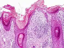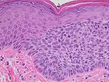 - Bowenoid: This term is controversial and usually refers to full-thickness atypia, microscopically indistinguishable from Bowen's Disease.[25] However most dermatologists and pathologists will use it in reference to tissue samples that are notable for small foci of atypia that involve the full thickness of the epidermis, in the background of a lesion that is otherwise consistent with an AK.[39]