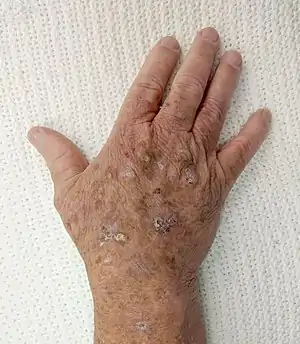 | Actinic keratosis seen on the back of the hands | |