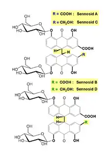Senna glycoside, also known as sennoside or senna, is a medication used to treat constipation and empty the large intestine before surgery.[1][5] The medication is taken by mouth or via the rectum.[1][6] It typically begins working in around 30 minutes when given by rectum and within twelve hours when given by mouth.[3] It is a weaker laxative than bisacodyl and castor oil.[1]