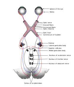 Typical sensory system: the visual system, illustrated by the classic Gray's FIG. 722– This scheme shows the flow of information from the eyes to the central connections of the optic nerves and optic tracts, to the visual cortex. Area V1 is the region of the brain which is engaged in vision.
