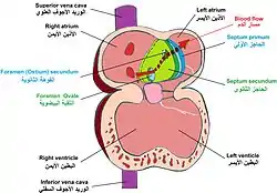 ![]() A labelled diagram of the developing heart, showing the relationship between the septum secundum (by the right atrium) and the septum primum (by the left atrium). | |