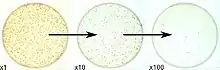 In biology and medicine, besides the more conventional uses described above, serial dilution may also be used to reduce the concentration of microscopic organisms or cells in a sample. As, for instance, the number and size of bacterial colonies that grow on an agar plate in a given time is concentration-dependent, and since many other diagnostic techniques involve physically counting the number of micro-organisms or cells on specials printed with grids (for comparing concentrations of two organisms or cell types in the sample) or wells of a given volume (for absolute concentrations), dilution can be useful for getting more manageable results.[1] Serial dilution is also a cheaper and simpler method for preparing cultures from a single cell than optical tweezers and micromanipulators.[2]